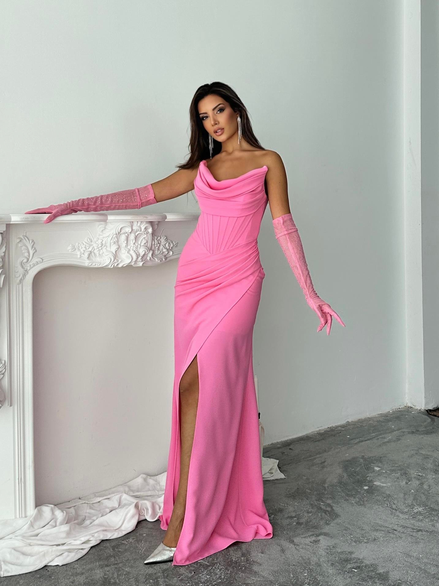 Eldivenli Krep Straplez Şık Tasarım Abiye Elbise - Şeker Pembe