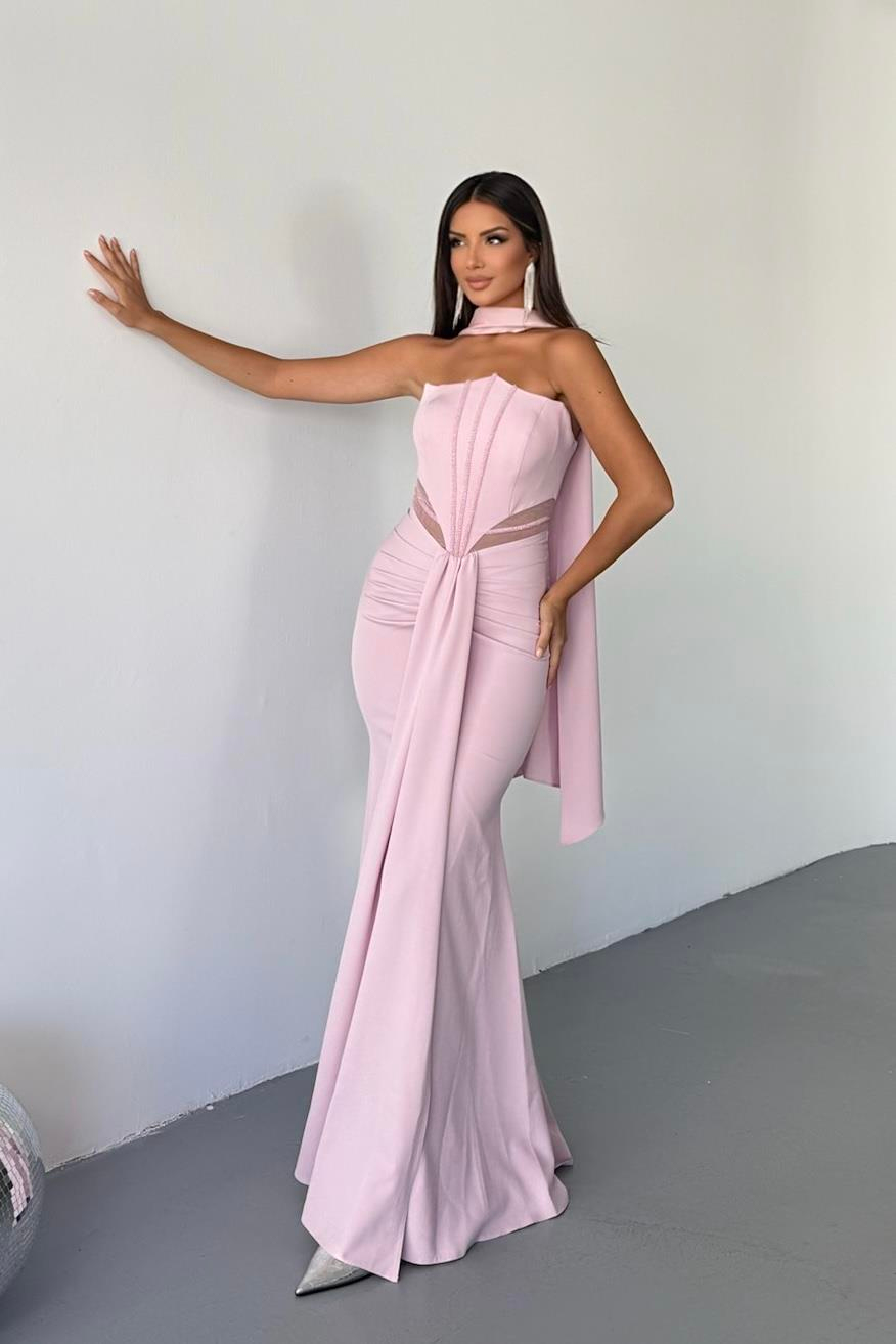 Krep Şallı Bel Transparan Ve Taşlı Yırtmaçlı Abiye Elbise - Pudra