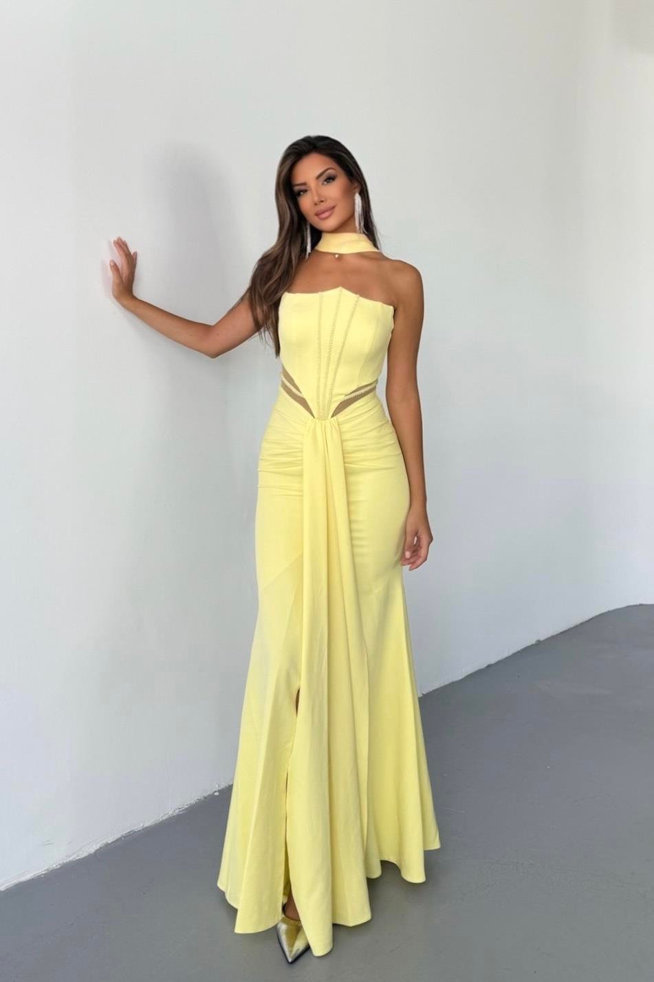 Krep Şallı Bel Transparan Ve Taşlı Yırtmaçlı Abiye Elbise - Sarı