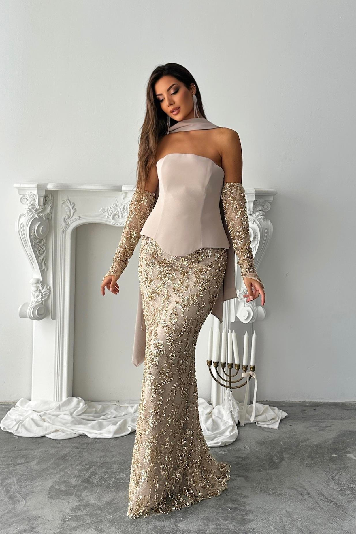 Şallı Ve Parça Payet Detaylı Takım Görünümlü Şık Tasarım Abiye Elbise - Bej