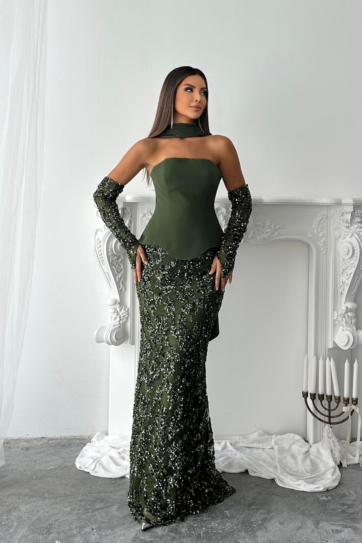 Şallı Ve Parça Payet Detaylı Takım Görünümlü Şık Tasarım Abiye Elbise - Haki
