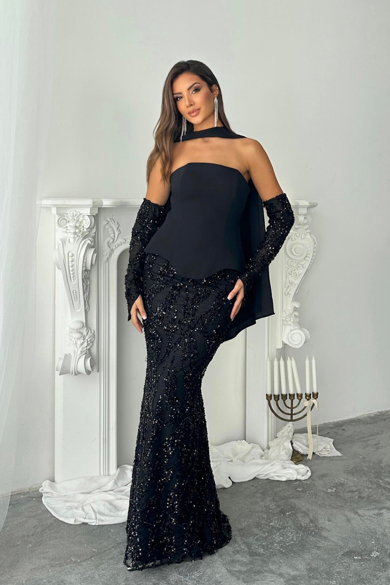 Şallı Ve Parça Payet Detaylı Takım Görünümlü Şık Tasarım Abiye Elbise - Siyah